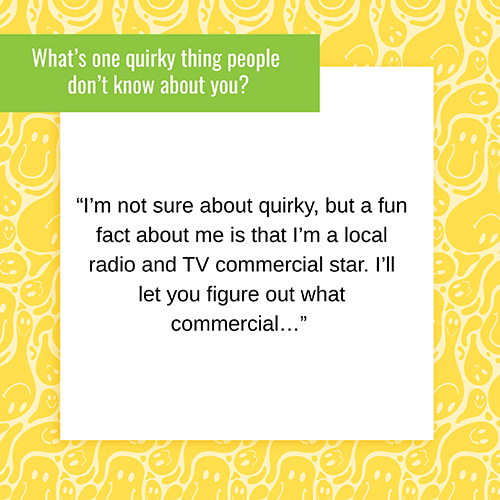 I’m not sure about quirky, but a fun fact about me is that I’m a local radio and TV commercial star. I’ll let you figure out what commercial…