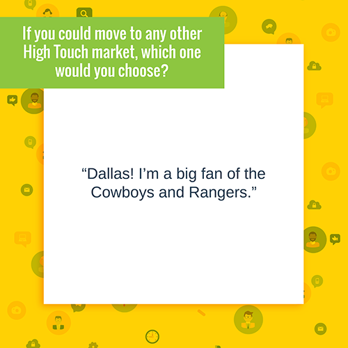 As part of our Employee Spotlight interview, we ask a series of lighthearted questions to highlight the unique, diverse personalities that make our High Touch team great. Maybe a candlelit dinner with hot dogs and the Cowboys game will soon be in store for Jonathan?