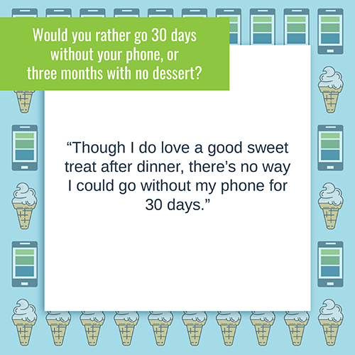 8. Would you rather go 30 days without your phone, or three months with no dessert?